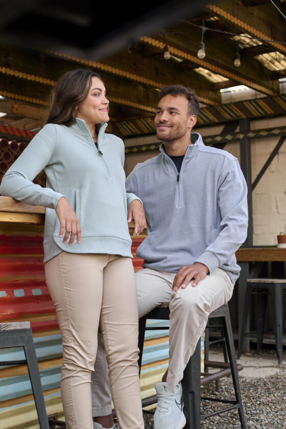 Hybrid teams tend to like a versatile approach with layer tees and quarter-zips that easily swap between home and the office, he says. Remote teams appreciate sweatshirts in various silhouettes, like crewnecks, to “provide a variety of polished, yet comfortable looks.” And for onsite teams, think about sweatshirts or softshell jackets, which can make for great uniforms that are both practical and comfortable, Ward explains.